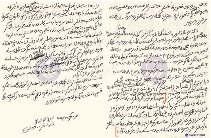 “Haber almışım ki, arabî (arabca) olarak eski huruf (harfler) ile Matbaa-i Evkaf’ta tab edilmek (basılmak) izni varmış. Eğer Cenab-ı Hakk’ın rahmetiyle, Türkçe olarak eski hurufa müsaade-i resmî olduğu dakikada ve Bekir Efendi şu iki risaleyi (Miraç ve Otuz İkinci Söz) Seyyid Şefik’in taht-ı nezaretinde (kontrolünde) tashihine gayet dikkat etmek şartıyla çabuk tab ediniz.” [48]