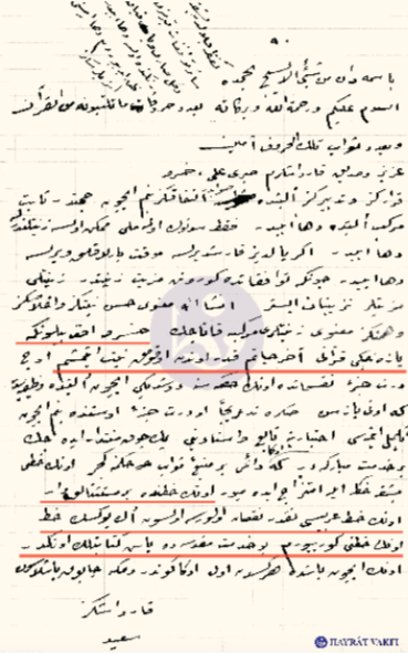 Üstad Bediüzzaman’ın Barla’daki talebelerine yazdırıp Hüsrev Efendi ve iki arkadaşına gönderdiği yukarıdaki mektubun orijinali